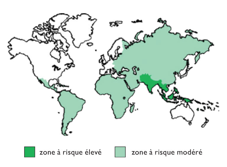 La fièvre typhoïde présente un certain nombre de zones à risque à l’échelle internationale : l’Asie, l’Asie du Sud, l’Afrique, les Caraïbes et l’Amérique Centrale et du Sud.